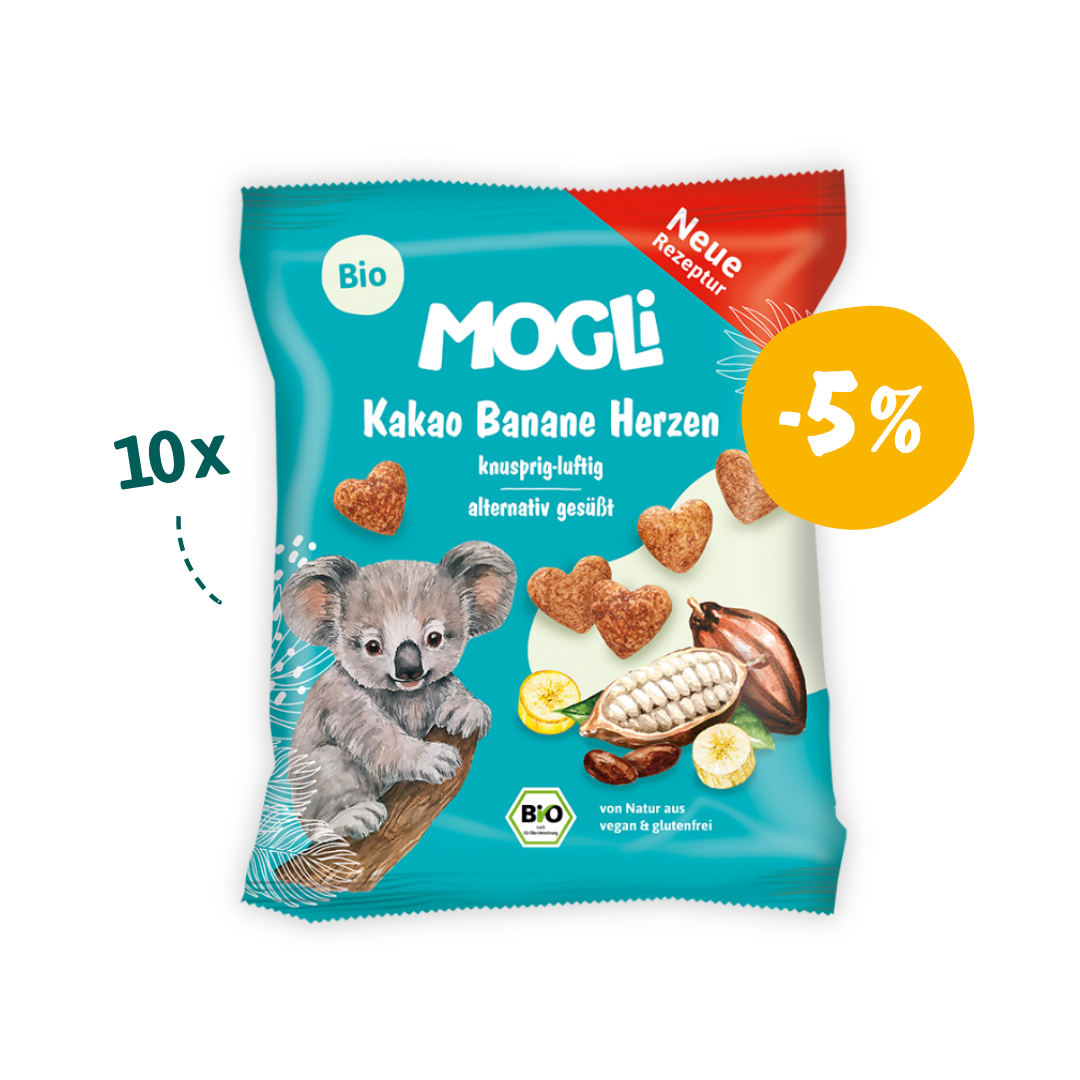 Knusperherzen für kleine Pausen – die MOGLi Kakao Banane Herzen sind ein echtes Highlight in jeder Brotbox. Hier trifft feiner Kakao auf die fruchtige Süße sonnengereifter Bananen. Gebacken aus Maisgrieß, mild gesüßt mit Agave und verfeinert mit einer Prise Zimt, bieten sie vollen natürlichen Geschmack mit nur fünf Zutaten. Von Natur aus vegan, glutenfrei und laktosefrei, ganz ohne Zusatzstoffe oder Aromen – und natürlich in bester Bio-Qualität. Ob in der Brotdose, beim Spielen im Park oder unterwegs auf kleinen Abenteuern: Die Kakao Banane Herzen sind luftig-leicht, lecker und perfekt für Kinder. Ihr milder Geschmack begeistert Klein und Groß gleichermaßen. Natürlich knabbern nur mit MOGLi!