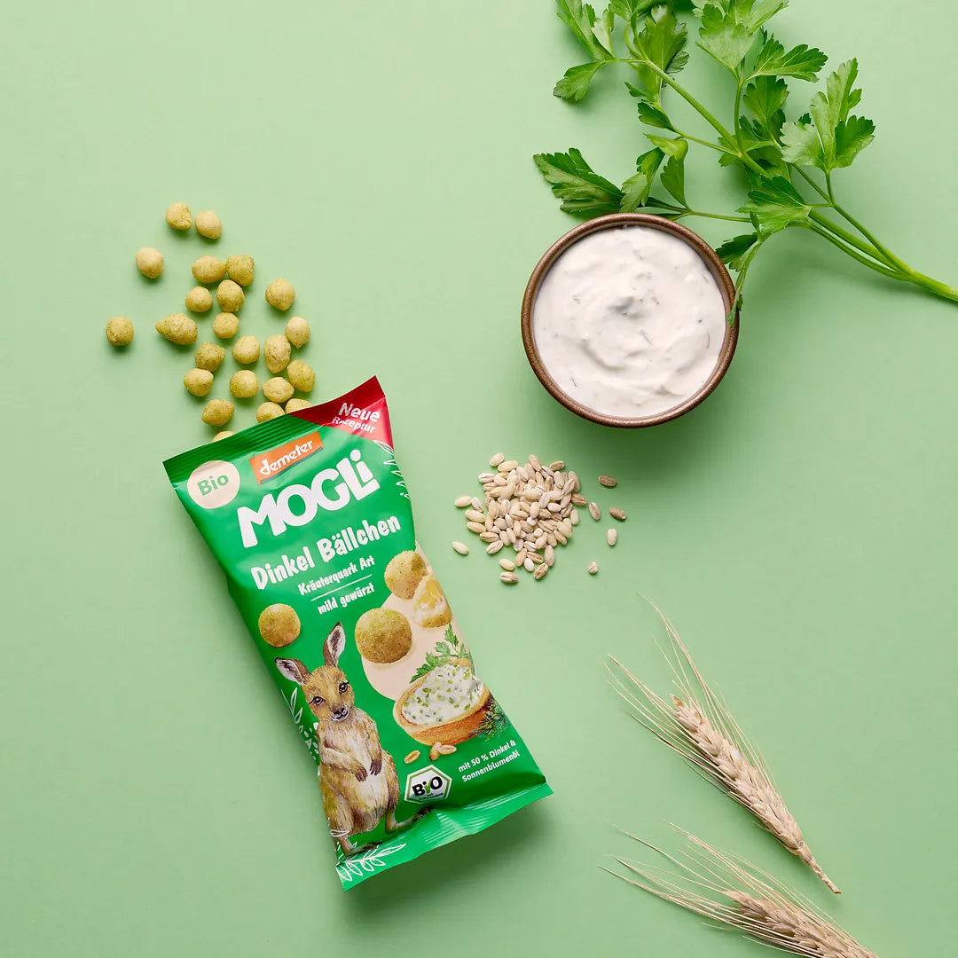 So schmeckt Abenteuerzeit – mit den MOGLi Dinkel Bällchen Kräuterquark! Luftig-leicht und knusprig gebacken, verfeinert mit mildem Dill und Petersilie, sind sie die perfekte Wahl für Kinder, die herzhafte Snacks lieben. Die kleinen Knusperbällchen enthalten nur wenige Zutaten, sind palmölfrei und kommen ohne Geschmacksverstärker oder künstliche Zusätze aus – dafür aber mit echtem natürlichen Geschmack. Denn alle Zutaten sind in Bio- und Demeter-Qualität. Perfekt für unterwegs, für kleine Pausen oder zum Teilen mit Freund:innen.