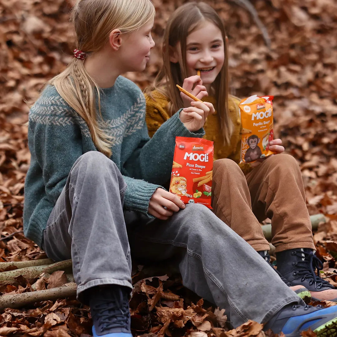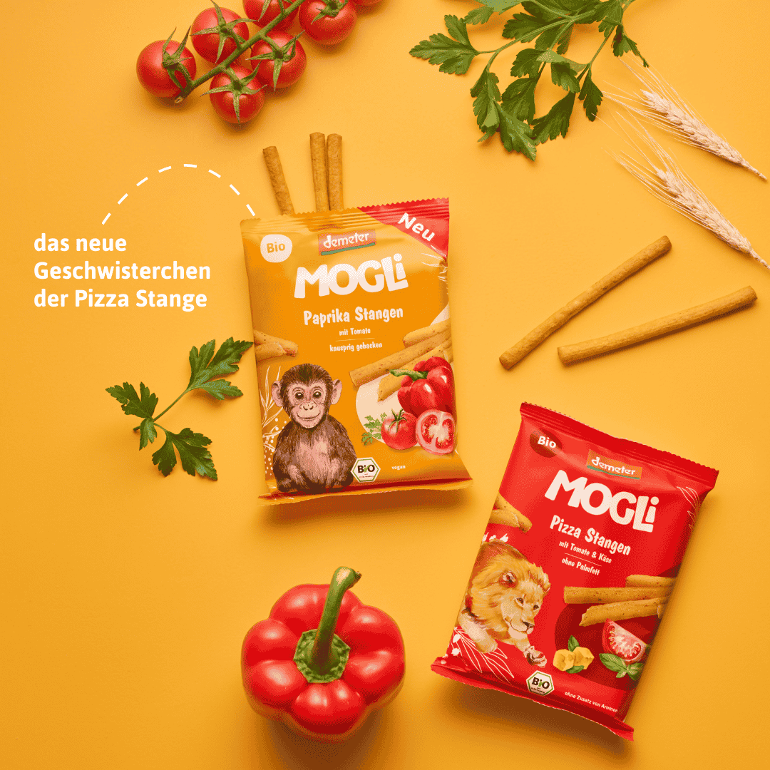 Knusprig gebacken, mild gewürzt und perfekt für kleine Hände: Die MOGLi Paprika Stangen sind der beliebte Kindersnack für unterwegs, die der ganzen Familie schmecken. Mit fruchtiger Paprika, Tomate, Kräutern und bestem Olivenöl verfeinert, werden sie im Ofen goldbraun gebacken – ganz ohne Zusatzstoffe, Palmfett oder Schnickschnack.